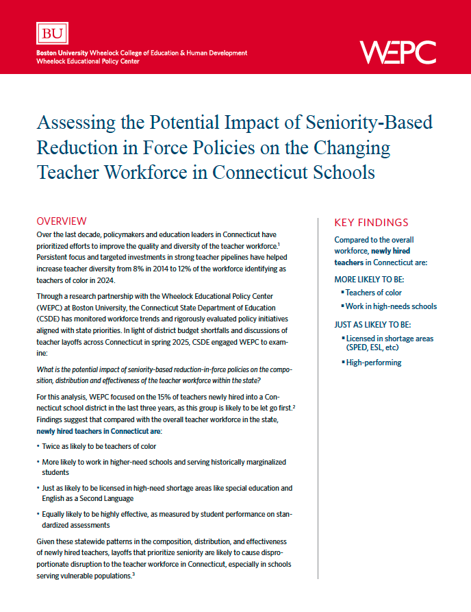 Through a research partnership with the Wheelock Educational Policy Center (WEPC) at Boston University, the Connecticut State Department of Education (CSDE) has monitored workforce trends and rigorously evaluated policy initiatives aligned with state priorities. In light of district budget shortfalls and discussions of teacher layoffs across Connecticut in spring 2025, CSDE engaged WEPC to examine: